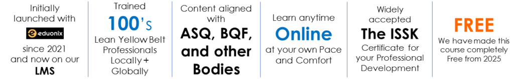 This Certified Lean Yellow Belt in Manufacturing program provides students with good level of knowledge on Lean concepts highly needed for the Manufacturing sector. This program is designed to be aligned with ASQ, BQF, and other leading Industrial bodies. This program starts from basics concepts and then discusses important concepts which are needed in building Lean Enterprises and high-Performance Manufacturing plants. The course involves plenty of practical examples and provides the learner with the highest level of learning experience.